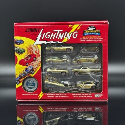 Johnny Lightning is a brand of diecast model cars launched in 1969 by Topper Corporation (owner of the “Topper Toys” brand), similar to the hugely successful Mattel’s Hot Wheels cars. They were notable at the time for being extremely fast compared to other brands of die-cast cars. Their most important technology was to mold in a small hook under the front axle so that they could be propelled by a lever-driven catapult, far faster than could be obtained by either gravity, or battery powered “supercharger” devices.