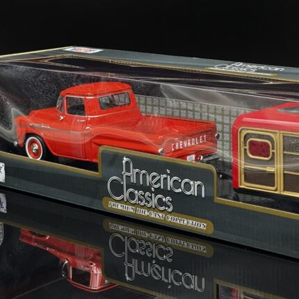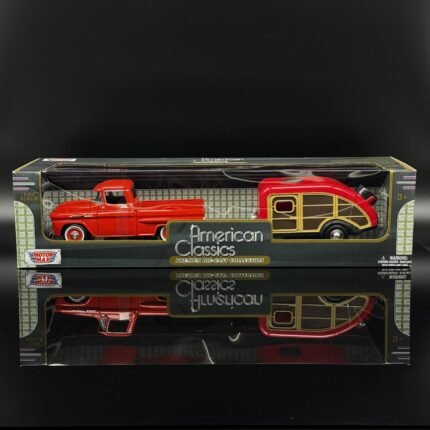 1958 Chevrolet Apache Pick-Up with Trailer Roulotte 1:24 Scale Diecast Model by MotorMax – Red Classic Vintage Truck & Caravan Set