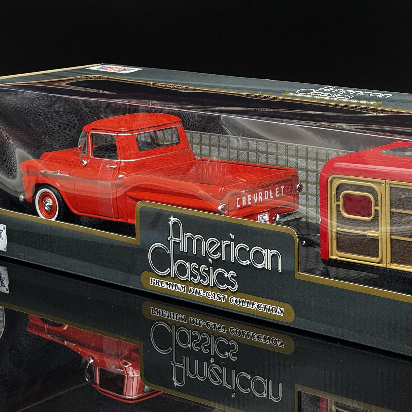 A premium 1:24 scale 1958 Chevrolet Apache Pick-Up with Trailer Roulotte by MotorMax in vibrant red. A beautifully detailed vintage truck and caravan set—perfect for collectors and display.