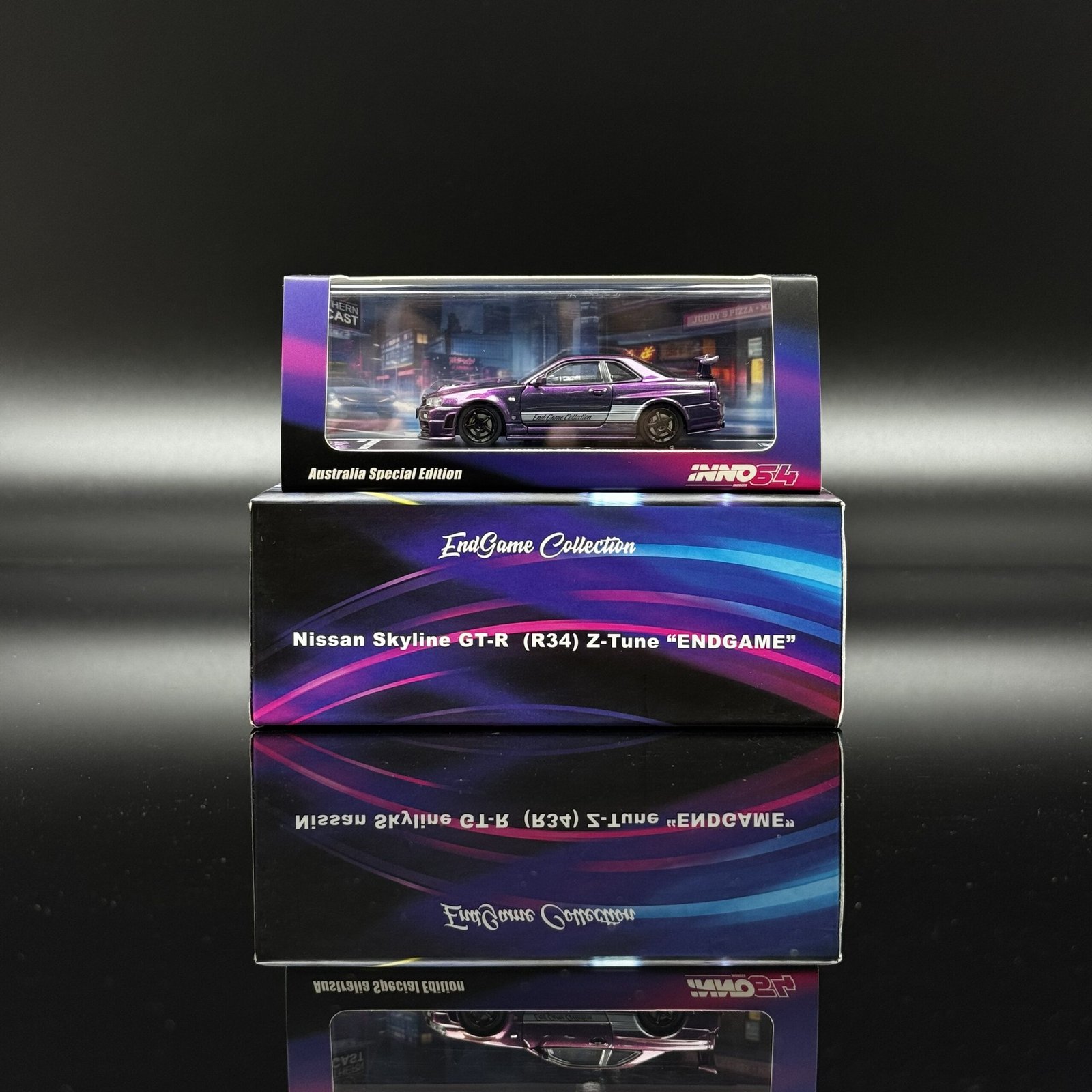 1:64 Nissan Skyline GT-R R34 Z-Tune “End Game” by INNO64 in Violet. A premium diecast model with bold styling and collector-grade detail.