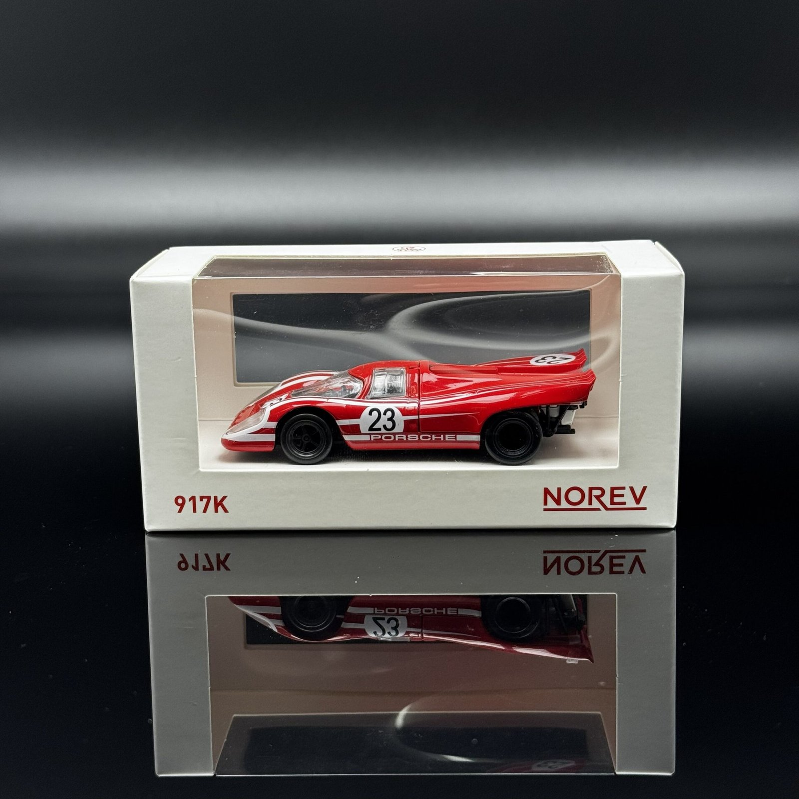 Finished in the unmistakable red livery with authentic race markings, including the iconic number 23, this 1:43 scale model captures the aerodynamic design and racing spirit of the Porsche 917K. Every detail, from the sleek long-tail body to the precision-crafted wheels and decals, reflects Norev’s dedication to quality and realism.