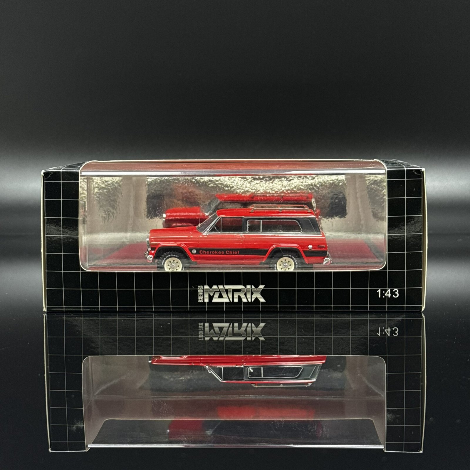 Limited edition 1:43 Jeep Cherokee Chief 1980 diecast model by MATRIX (138/408) in red/black—perfect for collectors of classic SUVs.